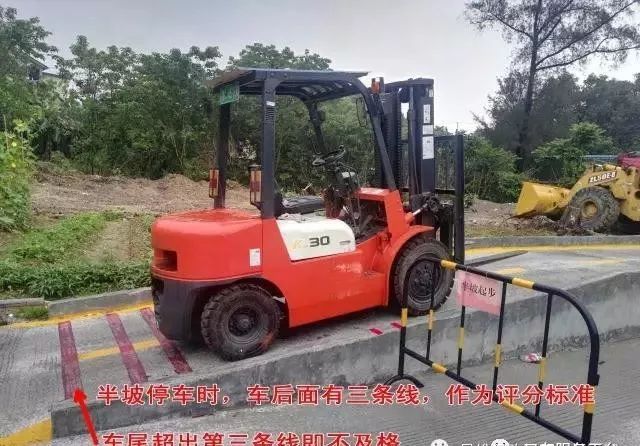 半坡起步:車上右手邊有一紅色箭頭,半坡停車時,車上箭頭要對準場地邊上的指定區(qū)域(紅線標注的);稍作停頓即可,起步時,左腳放離合要慢,右腳同步加大油門,注意同步操作,便于起步。
